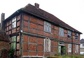 Ein weiter Grund für den schlechten Zustand vieler alter Gebäude ist, dass zu Zeiten der DDR kaum etwas für deren Erhalt getan wurde. Für etlichen Bauwerke sind heutige Zeiten aber auch nicht besser. Was nütz es, wenn man ein Gebäude als Baudenkmal deklariert, die einstigen Nutzer vertreibt, zum Kauf ausschreibt aber keinen Käufer findet weil der Wiederaufbau mit vielen Auflagen verbunden ist. Oft sind Gebäude der Gemeinde verschrieben worden die aber wegen ihrer knappen finanziellen Mittel den Erhalt nicht bestreiten können. (Bild: Schäferhof, Frehne)