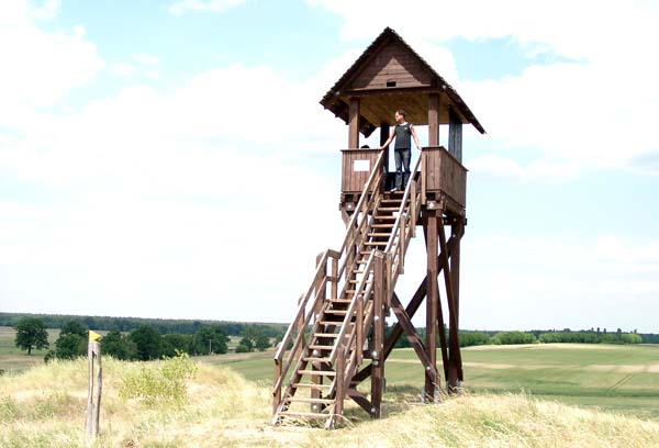 Westlich über Groß Leppin, dort kann man auf dem Mühlberg einen kleinen Aussichtsturm besteigen (Bild), nach Plattenburg – Bad Wilsnack und weiter.