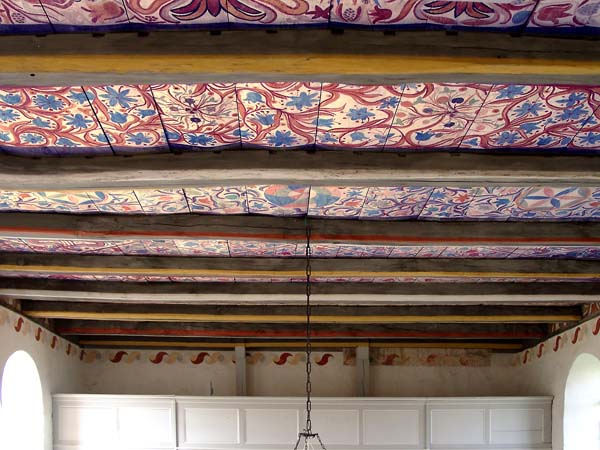 Durch elf quer liegende Balken ist die Decke in zehn streifenartige Felder gegliedert. Die Deckenbretter sind mit Holznägeln oben auf den Balken befestigt und bilden gleichzeitig den Bodenbelag des Dachraumes.