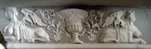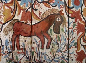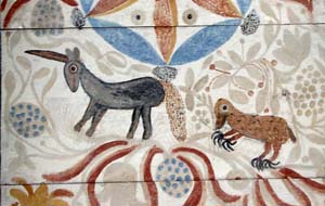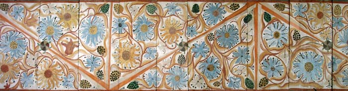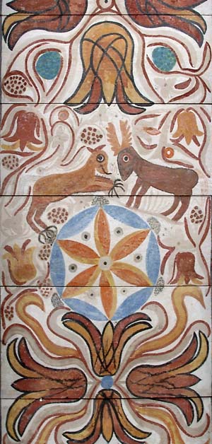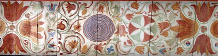 Die vertikalen Füllhölzer zwischen den Balken auf der Mauer tragen ebenfalls ein Blütendekor. Unterhalb dieser, auf dem oberen Abschluss der Mauern sieht man ein mit Zirkelschlägen konstruiertes, geometrisches Wellenband, ‚laufender Hund‘ genannt.