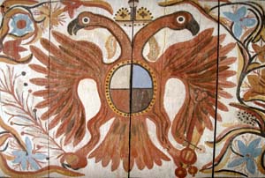 Im Bild links sieht man den Doppeladler des Heiligen Römischen Reiches deutscher Nation in abgewandelter Form – statt schwarz auf gold ist dieser rot wie der märkische Adler. Die zwei Köpfe stehen für Cherubim und Seraphim, der Einheit zweier Gewalten. Die symbolische Bedeutung der anderen Figuren ist unbekannt.