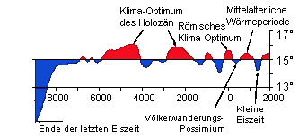 Aus Jägern und Sammlern wurden Ackerbauer und Viehzüchter. Hauptsächlich waren es die milden Winter mit warmen Niederschlägen die die Menschen sesshaft werden ließen. Mitteleuropa wurde neu besiedelt. Das ganze Jahr über wurde das Vieh zum Weiden in den Wald getrieben. Während des ganzen Jahres konnten Früchte geerntet werden. Diese Warmzeit dauerte etwa 1500 Jahre, geringfügigere folgten. Bis in unsere Zeitrechnung hinein gab es weitere, kürzere und weniger intensive Warmzeiten etwa während der Ausbreitung des Römischen Reiches, Hannibal überquerte mit Elefanten die fast eisfreien Alpen, und zur Hochzeit des Mittelalters. Dazwischen gab es immer wieder deutliche Kältephasen. Durch diese Launen der Natur wurden ganze Völker dazu bewegt umherzuziehen. Arteigen waren die Menschen sowieso bestrebt neues Land zu gewinnen, da das alte ermüdet war, nur noch wenig Ertrag brachte. So siedelten germanische Stämme einst in Skandinavien, zogen dann südwärts, andere rückten nach… Wenn man Klimakurven dem Aufblühen und Niedergehen menschlicher Kulturen gegenüberstellt, sieht man deutlich wie Klimaveränderungen den Menschen beeinflussten.