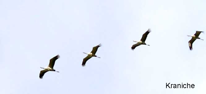 Kiebitze, auch wenn sie nicht mehr hier brüten, verweilen während ihres Zuges im Herbst, regelmäßig mehrere Tage auf umliegenden Feldern. Desgleichen kann man im Frühjahr und Herbst für einen Zeitraum von mehreren Wochen Kraniche beobachten. Ein faszinierendes Schauspiel ist, wenn sich mitunter hundert der imposanten Vögel in die Lüfte erheben. Selbiges Naturschauspiel wiederholt sich (im Herbst Wochen später) mit den Graugänsen. Auch sie halten hier inne. Man kann sie bis in den Winter hinein sehen oder oft auch nur hören, wenn sie im abendlichen Nebel nach einem Quartier suchen. Nicht so häufig sieht man Graureiher und Schwäne. Den schon oben erwähnten Eisvogel zu sehen bedarf noch mehr Geduld und Glück. Auch er hat einen charakteristischen Ruf oder besser Schrei, wenn er einen Landeplatz ansteuert.